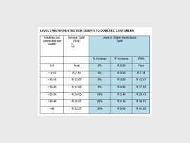 The restriction tariffs are imposed in a stepped manner with 10 per cent tariff increase with consumption between 20 and 30 kilolitres a month. Thereafter a 20 per cent increase with consumption between 30 and 40 kilolitres a month and 30 per cent with consumption above 40 kilolitres a month.