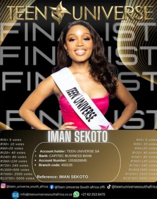 To vote, supporters can create the Teen Universe Beneficiary on their banking app, select a voting amount as indicated on her poster, and use: Iman Sekoto, as the reference.