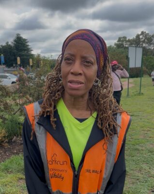 Bryanston parkrun volunteer Alice Brown lends her time as a tail walker, ensuring every participant finishes safely during the weekly 5km community run. Photo: Xoliswa Zakwe