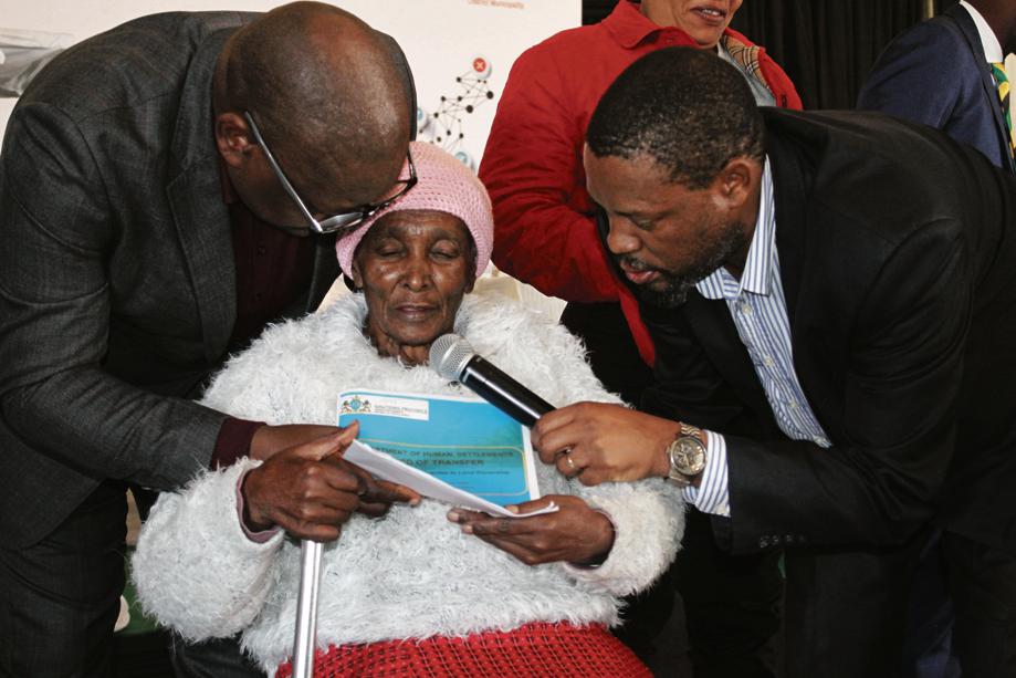 Gogo Diboeng Sefura, a 90-year-old, receives her title deed from Executive Mayor Jacob Khawe and Premier of Gauteng David Makhura on Friday at Golden Gardens.