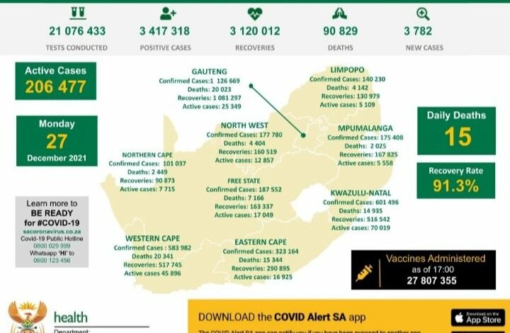 This brings the total number of infections to 3 417 318, with the national death toll reaching 90 829.