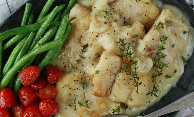 You’ll need: 30ml olive oil; 1 onion, thinly sliced; 5 sprigs thyme; 1 Tbsp Dijon mustard; 2 Tbsp lemon juice; 1 x Royco Roasted Garlic Sauce; 250ml water; salt; pepper; 1 cup flour; 8 x 50-60g or 4 x 100-120g portions hake; 125ml oil