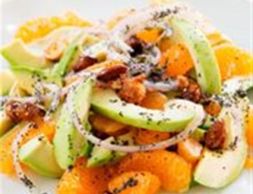 - Arrange the avocado on a platter, with the naartjies and nuts, pour the dressing and marinated onions over the salad.