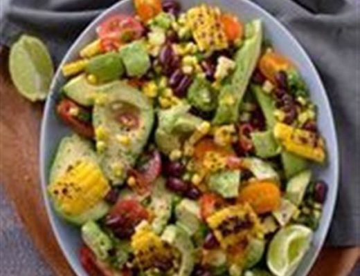 Halve avocados and toss gently with cherry tomatoes, grilled sweetcorn, kidney beans, chopped chives and peppadews. Serve with a squeeze of lime juice and freshly ground black pepper.