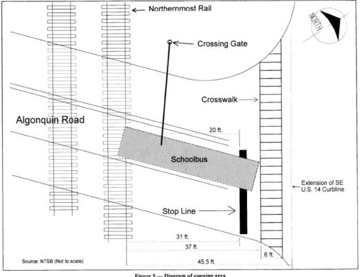 The National Transportation Safety Board (NTSB) investigation found that, while the bus driver was not aware that a portion of the bus was on the tracks as she should have been, the timing of signals was so insufficient that, even if she had identified the hazard as the train approached, she would have had to proceed against a red traffic signal into the highway intersection to have moved out of the train’s path.