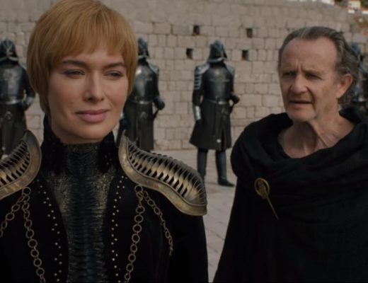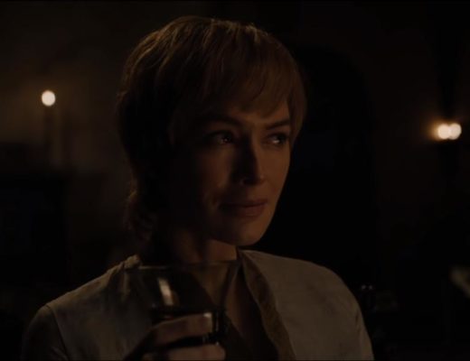 At around 1.05 in the trailer, a visually distraught and tearful Cersei can be seen sipping on a glass of wine – anyone who knows Cersei knows that there are only five things Cersei cares about, three of them were her dead children.