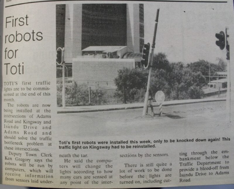 These were installed at the Kingsway – Adams roads intersection (Andrew Zondo and Khotho Mkhunya roads today) to improve the flow of traffic that would often bottleneck at that point. This was 63 years after the first robots were installed in Durban in 1930.