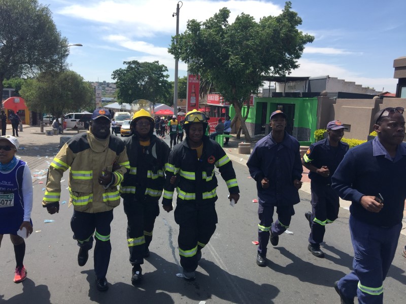 THREE City of Johannesburg Emergency Management Services (EMS) firefighters ran the Old Mutual Soweto Marathon in their Bunker Gears to pay tribute to their colleagues who lost their lives in the line of duty at the Bank of Lisbon building on September 5.
