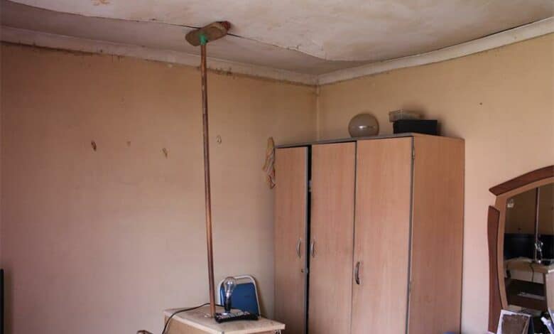 The crumbling ceiling in her bedroom is being held up by a chair, a small bedroom table, and a broom to ensure it doesn’t collapse on her. Much of the ceiling in her home has fallen off, making it easy for anyone to gain access to Margret’s home through the roof.