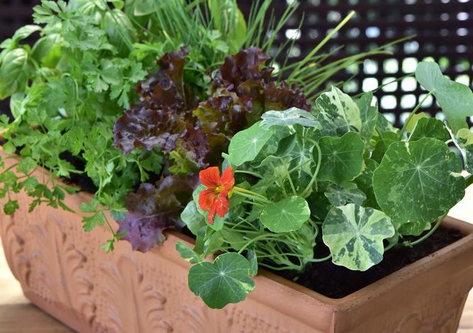 The herbs selected for this step-by-step by Rachel Diago of Healthy Living Herbs are salad herbs that can also be used in cooking and even for making herbal teas: sweet basil, chives, Italian parsley, mint, red leaf lettuce and nasturtiums. She used a container from Lifestyle Home Garden.