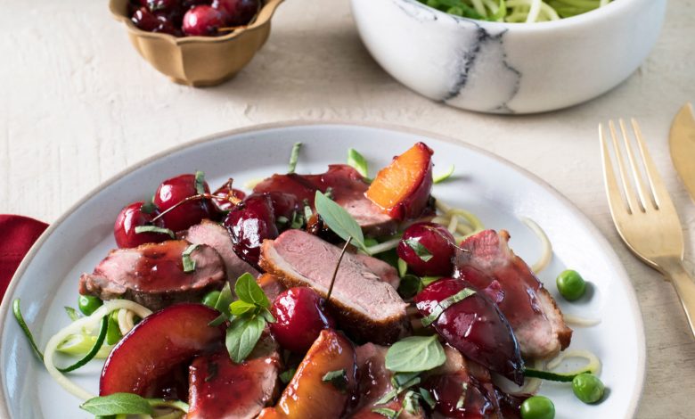- Place a bed of seasonal green vegetables on serving plates and top with the sliced duck and some of the plum and cherry salsa. Garnish with fresh mint.