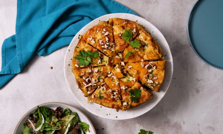 Allow to cool for 10 minutes, remove from the cake tin and place on a cake stand. Top with the toasted pecan nuts and fresh chopped parsley before cutting into 6-8 portions. Serve with a leafy green salad and enjoy!