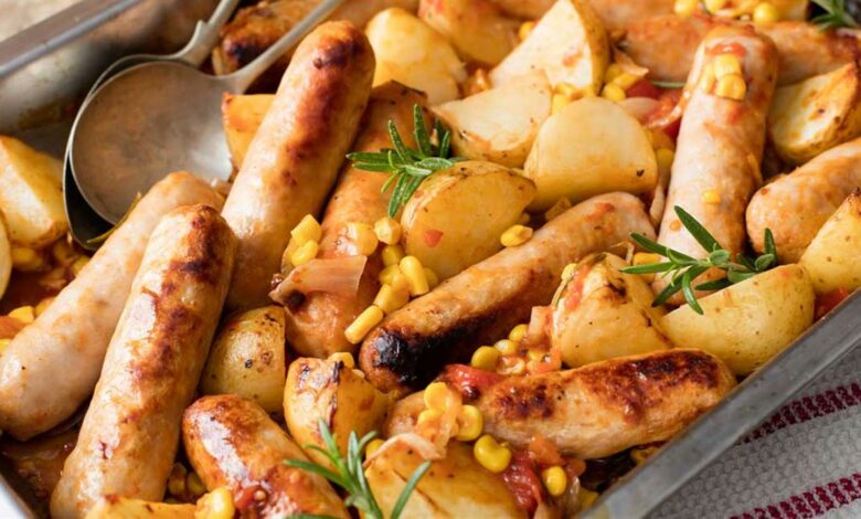 This quick and easy throw-together meal is rich in delicious pork sausages, quartered potatoes and colourful corn. One-pot means no cleaning up afterwards.