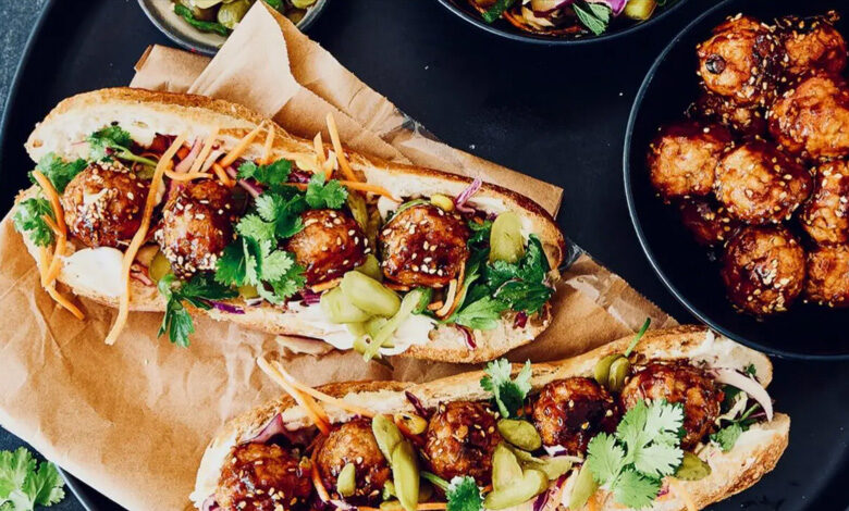 - Using a breadknife, cut the baguettes open without cutting through and hollowing out the sides so the rolls can hold more filling. Spread the insides generously with mayo and fill with coleslaw, pickles and meatballs.