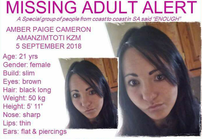 Local newsAMBER Paige Cameron (21) was last seen on Wednesday, 5 September in Amanzimtoti near the beach, when she and a…
