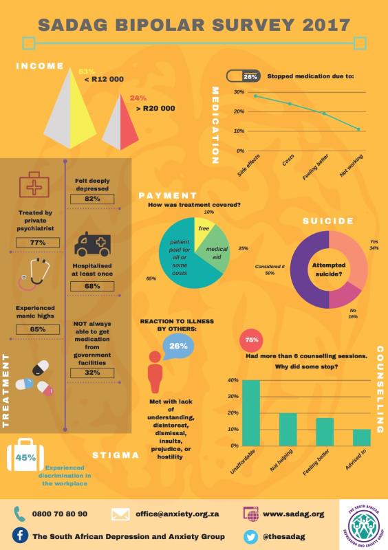“The results indicate a need for treatment, as 65 per cent of respondents report having manic highs, 82 per cent experienced deep depression and 67 per cent have been hospitalised at least once in their lifetime. Furthermore, 84 per cent have attempted or considered suicide. Of those that had previously attempted suicide, 27 per cent were younger than 30, and 28 per cent were earning less than R12,000 per month,” read a SADAG statement on the survey results.