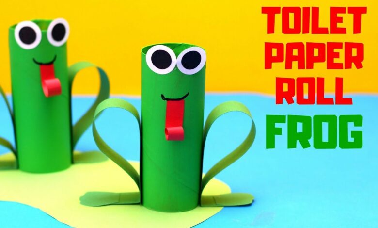 - Cut two strips from the green cardboard to make the frog legs. Attach one strip to each side of the toilet paper roll.