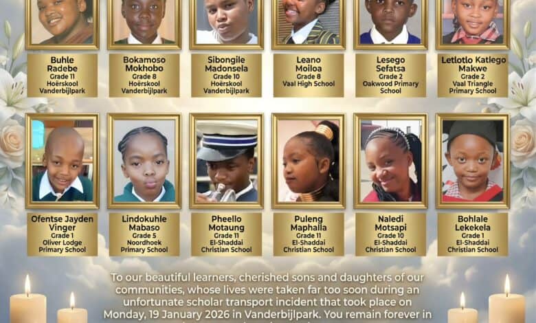 VANDERBIJLPARK – Die Gauteng Departement van Onderwys het vroeër vandag die name van die 12 leerlinge bekend gemaak wat hulle lewens in ‘n taxi-ramp Maandag 19 Januarie op die R553 naby Vanderbijlpark verloor het.