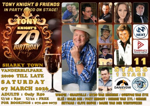 Tony het ‘n klomp van sy sanger vriende bymekaar getrek vir ‘n vertoning die 7de by Sharky Town in Vanderbijlpark. “Daar is ‘n toegangsfooi, maar ek het nou al so baie kaartjies vir vriende en familie weggegee, ek gaan nie ‘n sent maak nie,” lag hy.