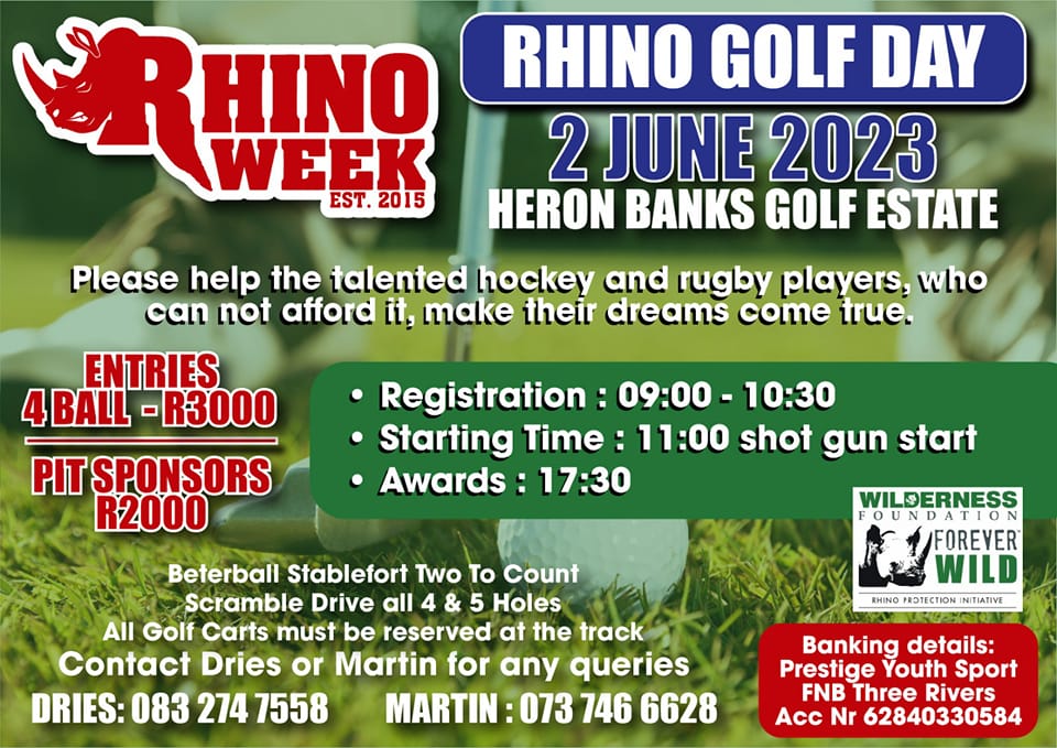 Die Rhino week se bestuur bied op 2 Junie by Heron Banks Golf Estate ‘n gholfdag aan om fondse vir dié spelers in te samel.
