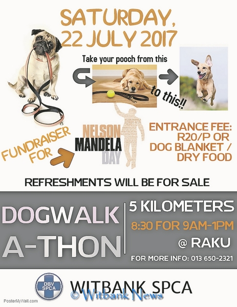 Local newsThe Witbank SPCA Dogwalk-a-Thon is taking place on July 22 from 08:30 to 13:00 at Raku.