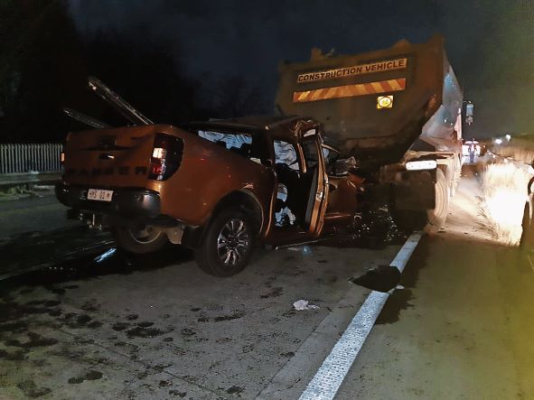 Dit word beweer dat die bakkie met ’n geweldige spoed binne in ’n stilstaande trok wat vermoedelik gebreek het in die middel van die pad, vasgejaag het.
