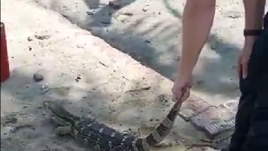 Local newsThe reptile had reportedly been on the geobags at the swimming beach and somehow ended up in the water.
