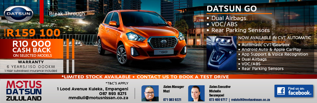 If you are looking to buy your first new car, then the GO must be on your shortlist. Visit the Datsun side at Motus Nissan Zululand and ask for a test drive.