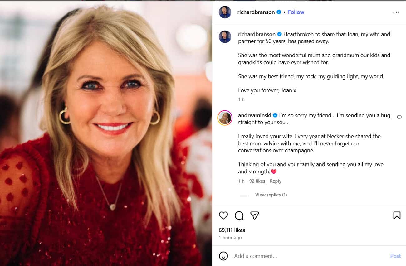 Sir Richard Branson’s wife, Joan, passes away