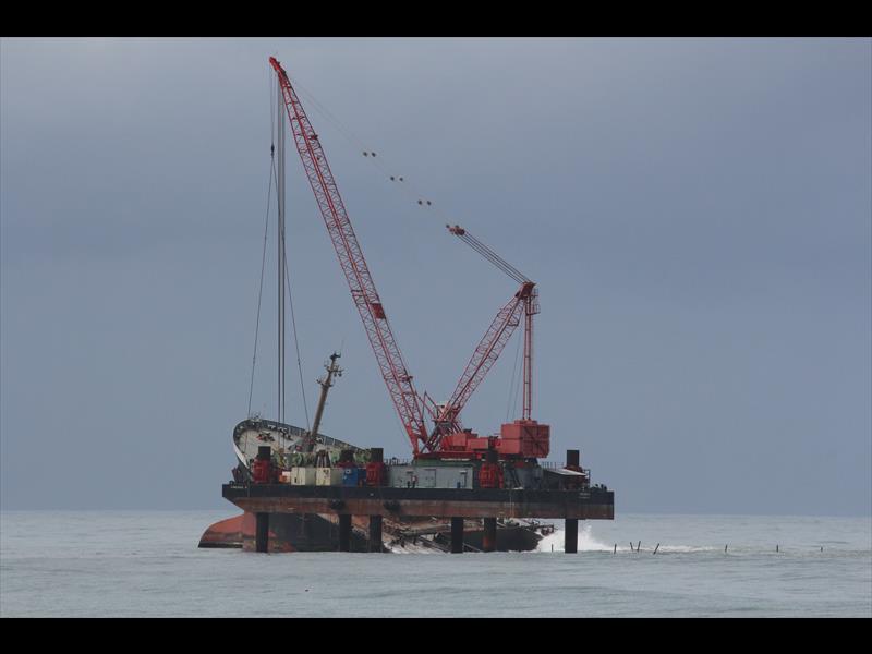 Salvage crews now have a solid platform from which to work as they continue the long process of emptying the holds and ultimately towing the fore section of the ship to be scuttled at sea.
