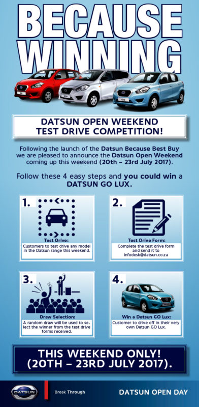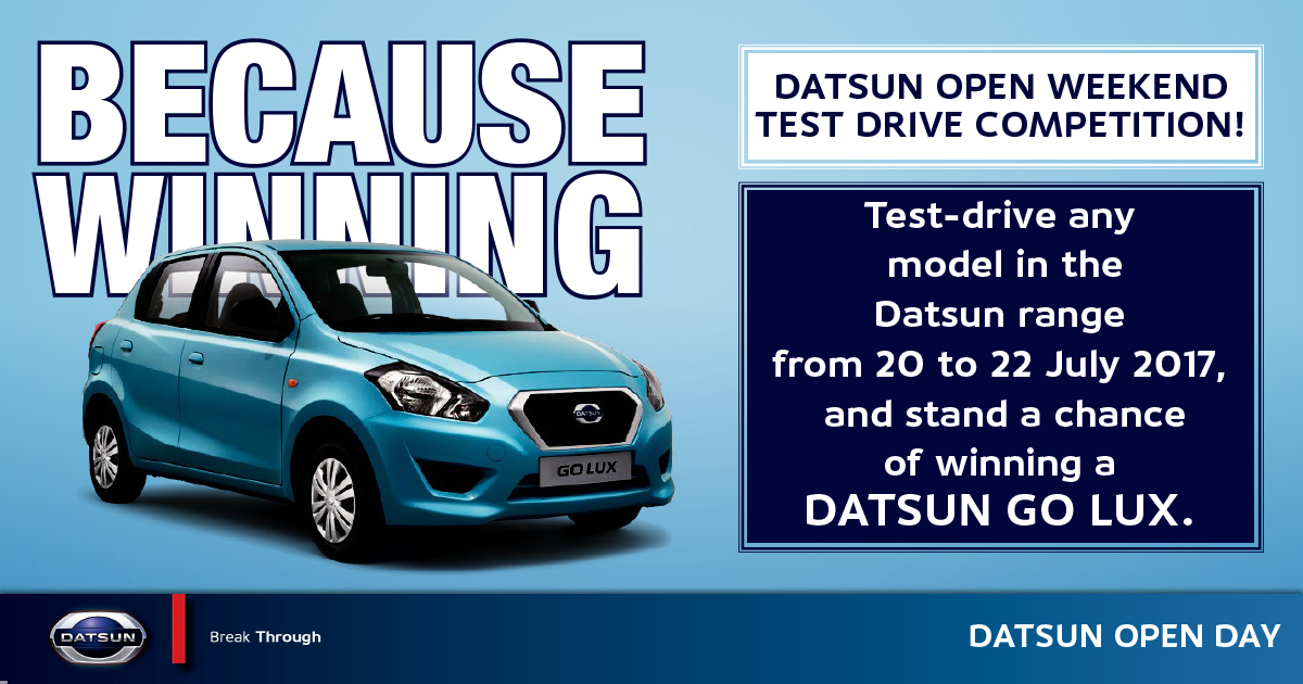 Customers are invited to come in and test drive any model in the Datsun range and stand a chance to win the Datsun GO LUX!