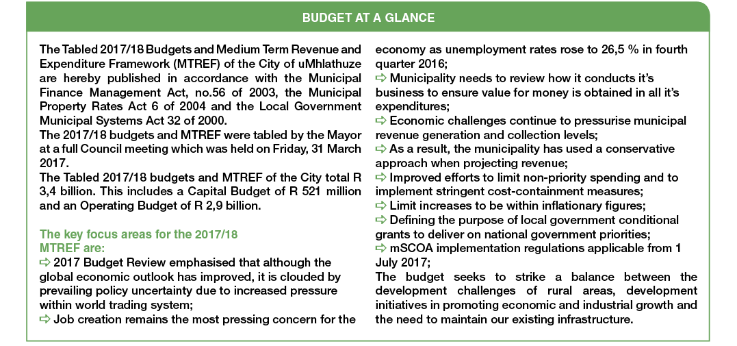 In closing, we are presenting this budget at a time when our economy is challenged. It is however our aim to remain vigilant in improving the lives of our citizens in uMhlathuze. We therefore call upon all people of uMhlathuze, including business to assist the municipality in making the City attractive to investors so that our economy can improve.