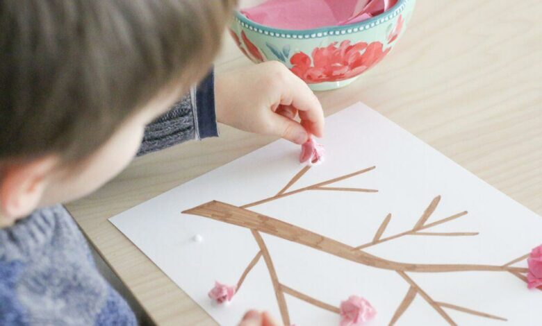 Help your child make beautiful cherry blossoms out of tissue paper. Children will enjoy scrunching tissue paper into small flowers and sticking them to their branch.
